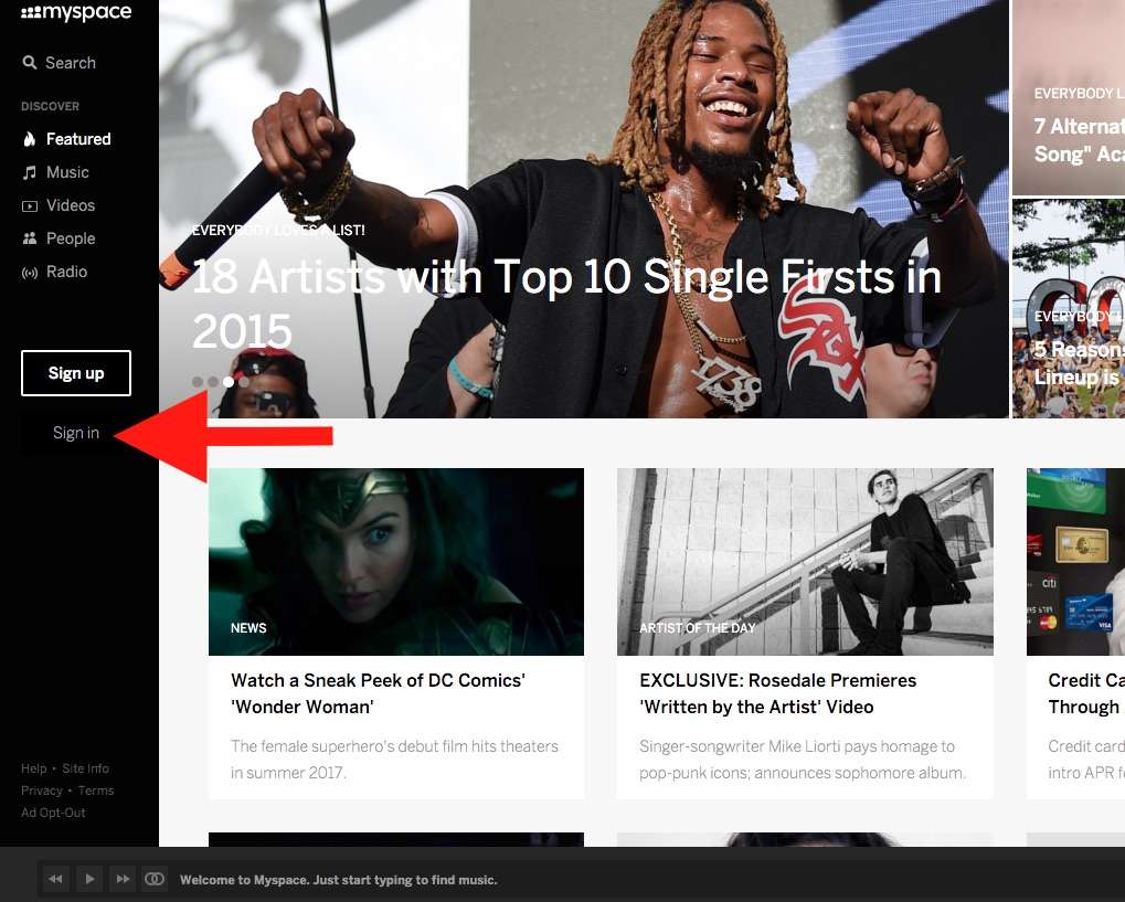 Step 1 Go to Myspace and Sign in. You will need to log in with your Original MySpace credentials email address and password to recover your old content. To retreive your old Myspace photos be sure that you are logged in to the new Myspace first.